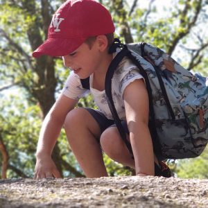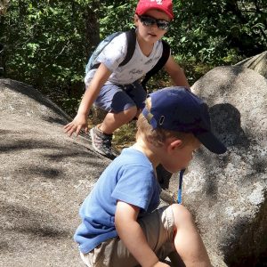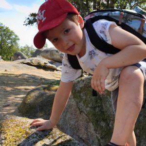 Plus on progresse, plus les cailloux se font de plus en plus gros. En chemin les garçons commencent à en escalader quelques-uns. Cachées sous l’humus et sous les feuilles, certaines pierres nous font trébucher et les petits genoux en font les frais.