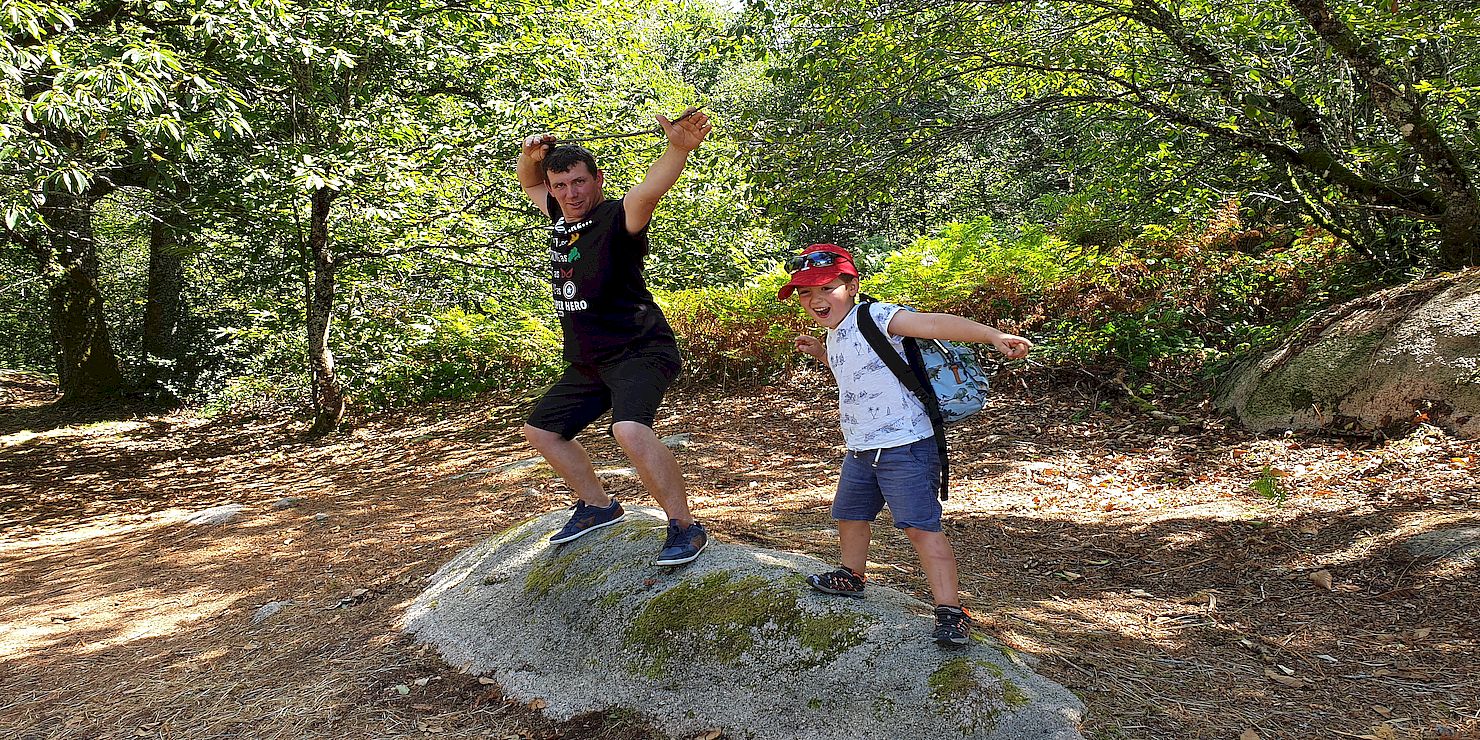 Plus on progresse, plus les cailloux se font de plus en plus gros. En chemin les garçons commencent à en escalader quelques-uns. Cachées sous l’humus et sous les feuilles, certaines pierres nous font trébucher et les petits genoux en font les frais.
