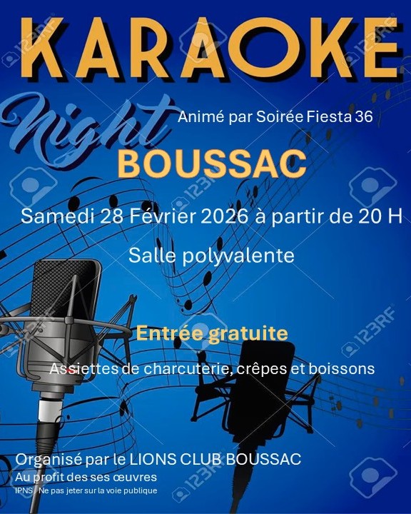 Le 28 Février 2026 Ajouter à mon Agenda Google Animation et fête locale 23600 BOUSSAC À propos Date Situation Informations de contact Retour à la liste Karaoké animé par Soirée Fiesta 36 Assiettes de charcuterie, crêpes et boissons. Date Le 28 Février Samedi Ouvre à 20h Situation Avis Ajouter un avis Annuler la réponseVotre adresse e-mail ne sera pas publiée. Les champs obligatoires sont indiqués avec *Nom - Prénom * Email * Enregistrer mon nom, mon e-mail et mon site dans le navigateur pour mon prochain commentaire. Votre note sur 5 : Commentaire