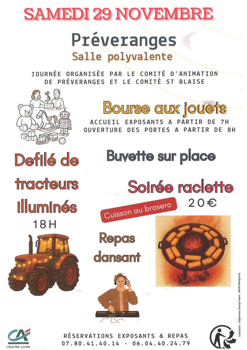 Le comité des fêtes et le comité de Saint Blaise organisent une journée festive à Préveranges! Toute la journée à partir de 8h une bourse aux jouets, venez faire des affaires à petit prix. A 18h vous en prendrez plein les yeux avec un défilé de tracteurs illuminés! Le soir repas dansant, au menu raclette!