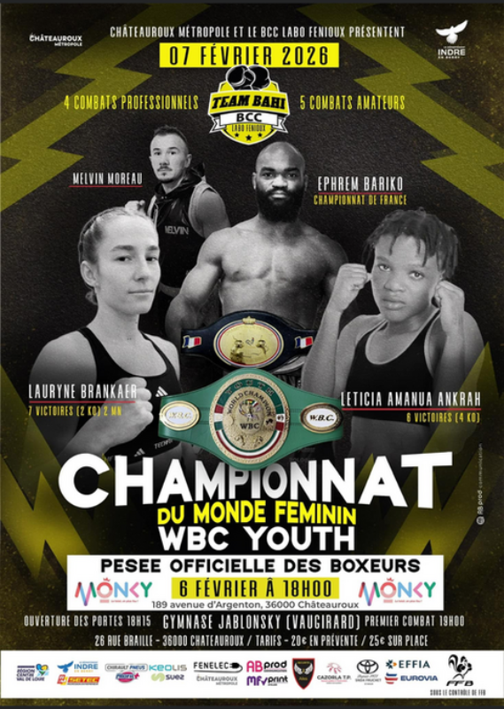 Le 7 février 2026, Châteauroux vibrera au rythme du sport ! Une soirée exceptionnelle vous attend avec le Championnat du Monde WBC YOUTH Féminin et le Championnat de France Masculin réunis sur un même événement. Du spectacle, de l’intensité et des champions au rendez-vous. À ne pas manquer !