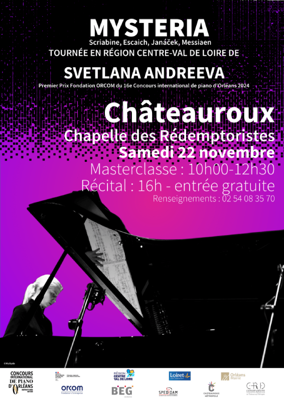Dans le cadre de la tournée Mysteria en Région Centre-Val de Loire, Svetlana Andreeva, lauréate du Premier Prix Fondation ORCOM lors du 16e Concours international de piano d’Orléans, proposera : le samedi 22 novembre une Masterclasse de 10h à 12h et un récital à 16h a la Chapelle des Rédemptoristes
