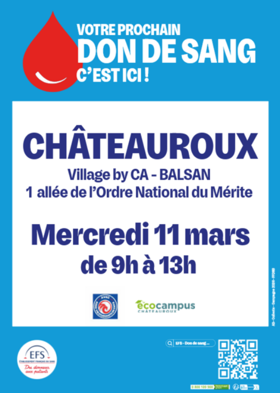 Venez nombreux le mercredi 11 mars de 9h à 13h au Village by CA (Balsan / le bâtiment avec l’horloge) à Châteauroux. La collecte se fait sur rendez-vous ! Pensez à réserver votre créneau en ligne.