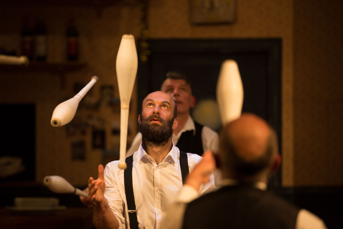 Dans une ambiance jazzy, le public découvre l’univers d’un grand restaurant avec sa hiérarchie, son stress et son décor détournés au service d’un comique de circonstance. Un lieu improbable avec ses employés typés et leur espièglerie, leur savoir-faire artistique, leur musique, les prouesses physiques de leur âge, et surtout leur bonne humeur. Le vrai repas, une cuisine simple mais remplie de saveurs et d’arômes, est servi à votre table par des artistes à la classe légendaire, et fait partie intégrante du spectacle.