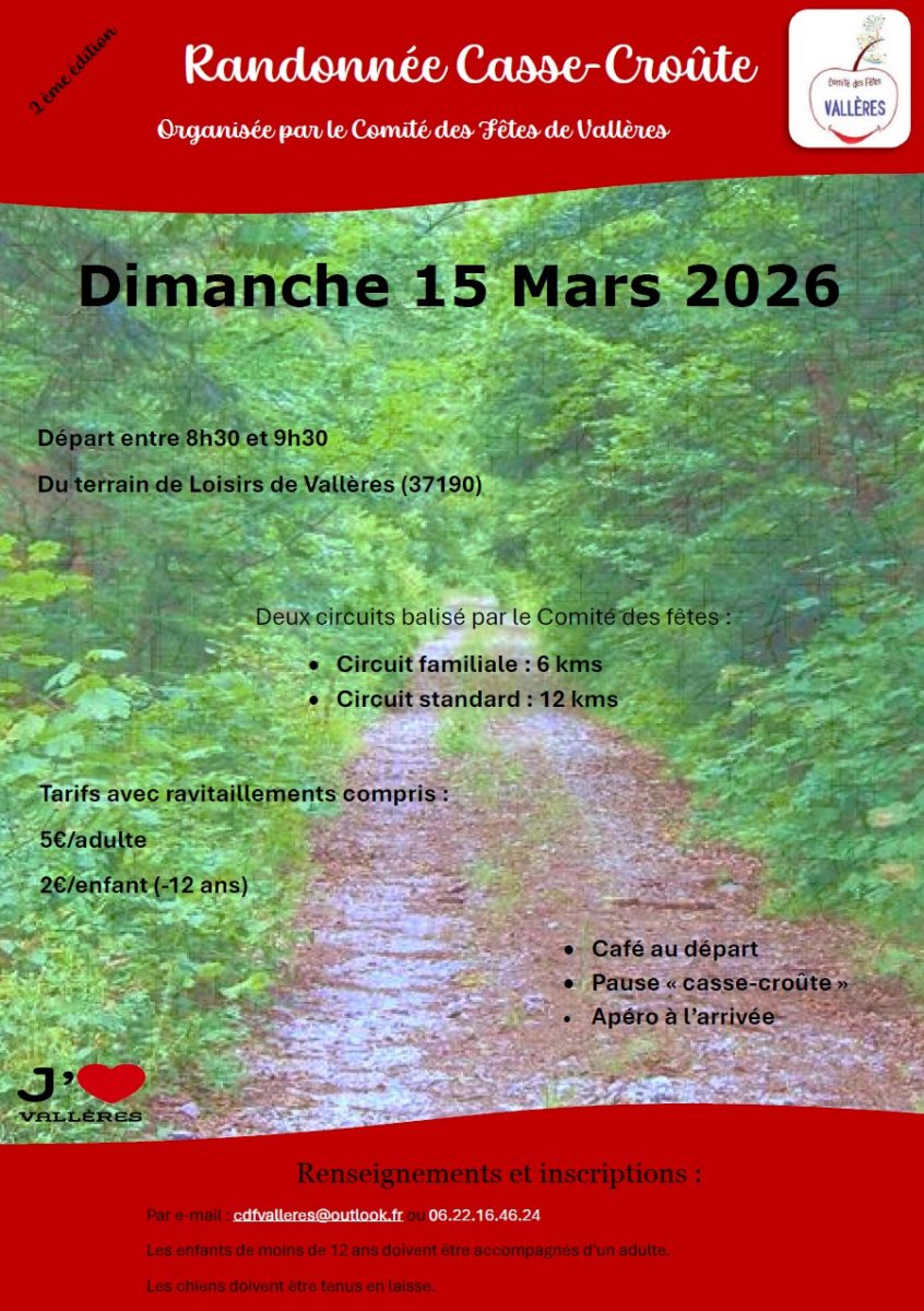 L'équipe du Comité des fêtes de Vallères est fière de vous annoncer que la randonné casse-croute est programmé pour le 15 Mars 2026.