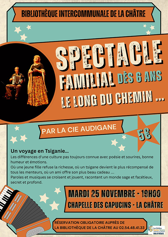 Le 25 Novembre 2025 Ajouter à mon Agenda Google Manifestation familiale / pour enfants Rue Jean Pacton Rue Jean Pacton 36400 LA CHATRE À propos Date Tarifs Situation Informations de contact Retour à la liste Spectacle jeunesse proposé par la bibliothèque de La Châtre. Spectacle jeunesse proposé par la bibliothèque de La Châtre. Date Le 25 Novembre Mardi Ouvre à 19h Tarifs Tarif enfant 5 € Situation Avis Ajouter un avis Annuler la réponseVotre adresse e-mail ne sera pas publiée. Les champs obligatoires sont indiqués avec *Nom - Prénom * Email * Enregistrer mon nom, mon e-mail et mon site dans le navigateur pour mon prochain commentaire. Votre note sur 5 : Commentaire