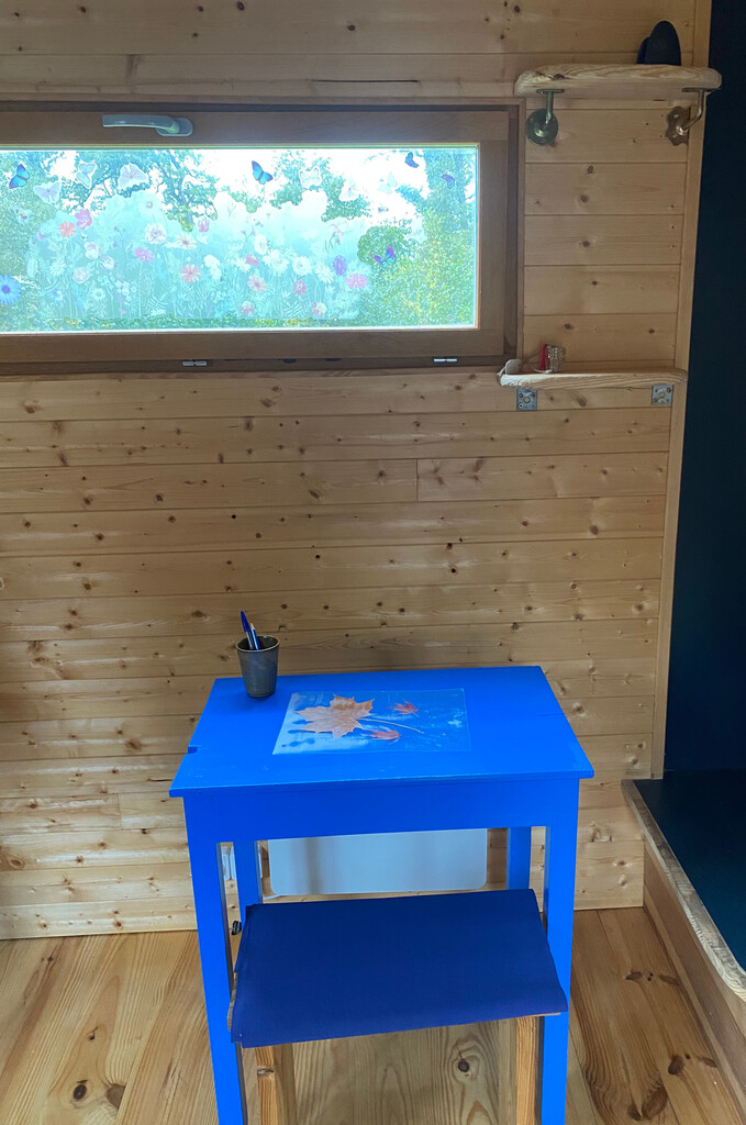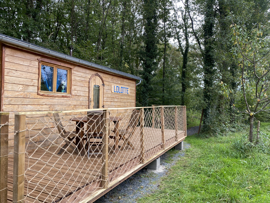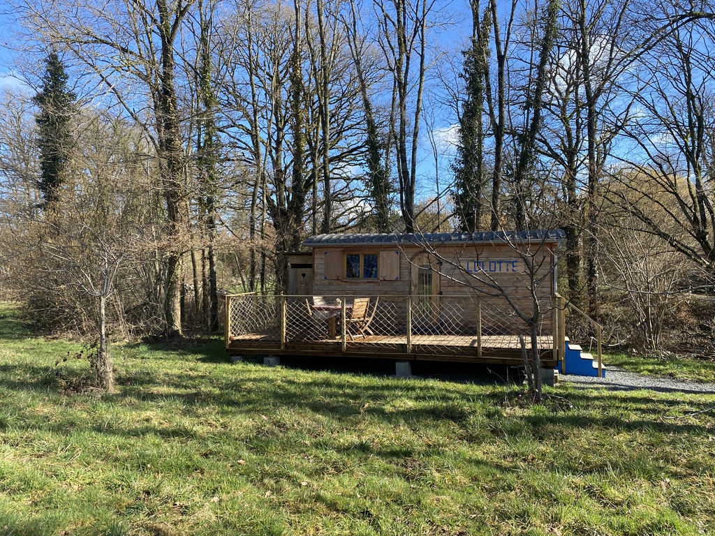 Roulotte creusoise avec terrasse surélevée en pin Douglas donnant côté jardin et côté rivière sur un terrain indépendant du domaine du moulin de Verneiges. Parking gratuit accessible sur place