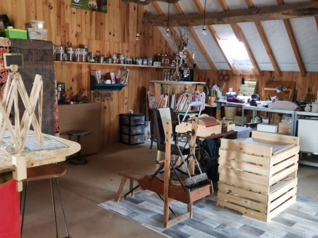 L'atelier de 80 m², situé à l’étage d’une dépendance, est équipé pour diverses activités créatives : travail de la laine, poterie, scrapbooking, vitrail, couture (machine à coudre, surjeteuse), teinture végétale, bricolage. Une bibliothèque est également à disposition.