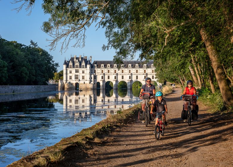 En arrivant à Loches, vous pourrez profiter d’une échappée vers Chenonceaux en suivant la mention « vers la Loire à Vélo ». Une belle portion vous attend avant d’atteindre la vallée du Cher pour découvrir la magnifique galerie du Château de Chenonceau qui enjambe la rivière.