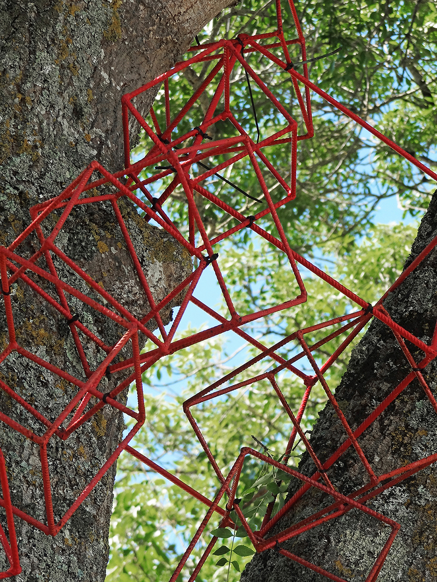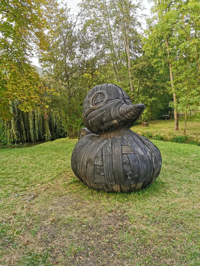 Nous sommes accueillies par un gros et étrange canard de bain constitué de pneus. Cette œuvre annonce la couleur du parcours artistique qui sera présent tout le long de notre déambulation : les Beaux Lieux. Chaque année, l’association B2X convie des artistes de tous horizons à créer des œuvres qui animeront ce paysage naturel. En résulte un beau cocktail de nature et de créations contemporaines. Le parcours offre de belles vues sur le patrimoine environnant : Logis Renaissance de Sansac sur votre gauche, le clocher de l’Abbaye de Beaulieu droit devant nous. Un demi-tour sur nous-même (attention, pas facile en vélo) nous offre une vue panoramique sur le donjon et la collégiale Saint-Ours de Loches. Le tableau est complet.