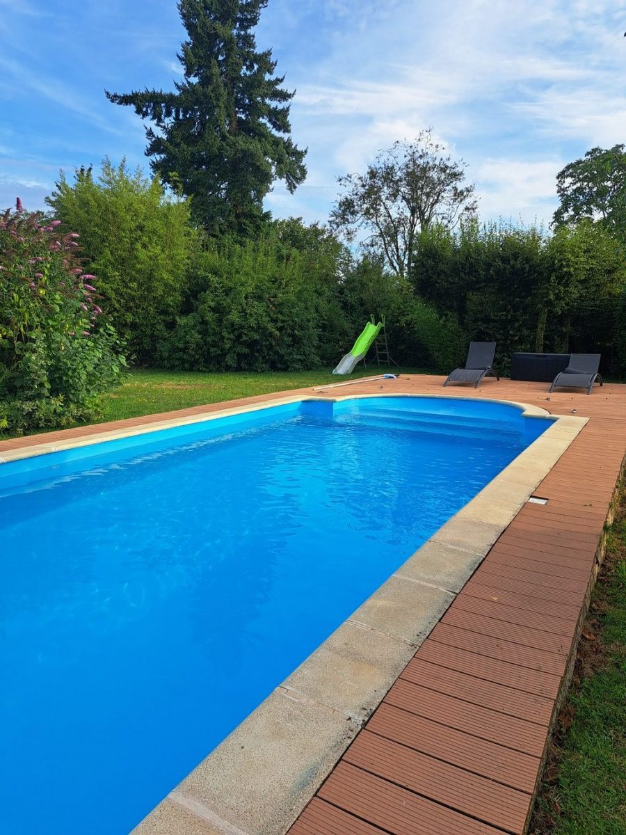 Cour et jardin avec piscine, jeux pour enfants, piscine, barbecue et salon de jardin.