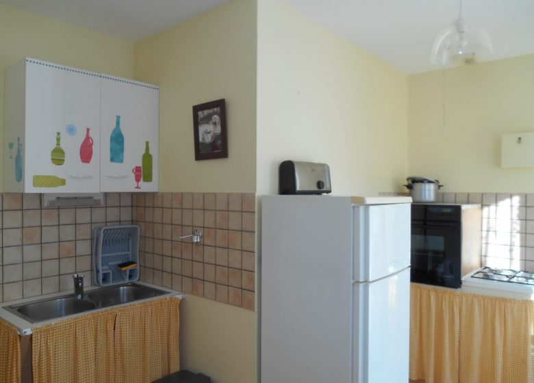 équipée (four, plaques gaz, frigo, micro-ondes, cafetière, bouilloire, grillepain)