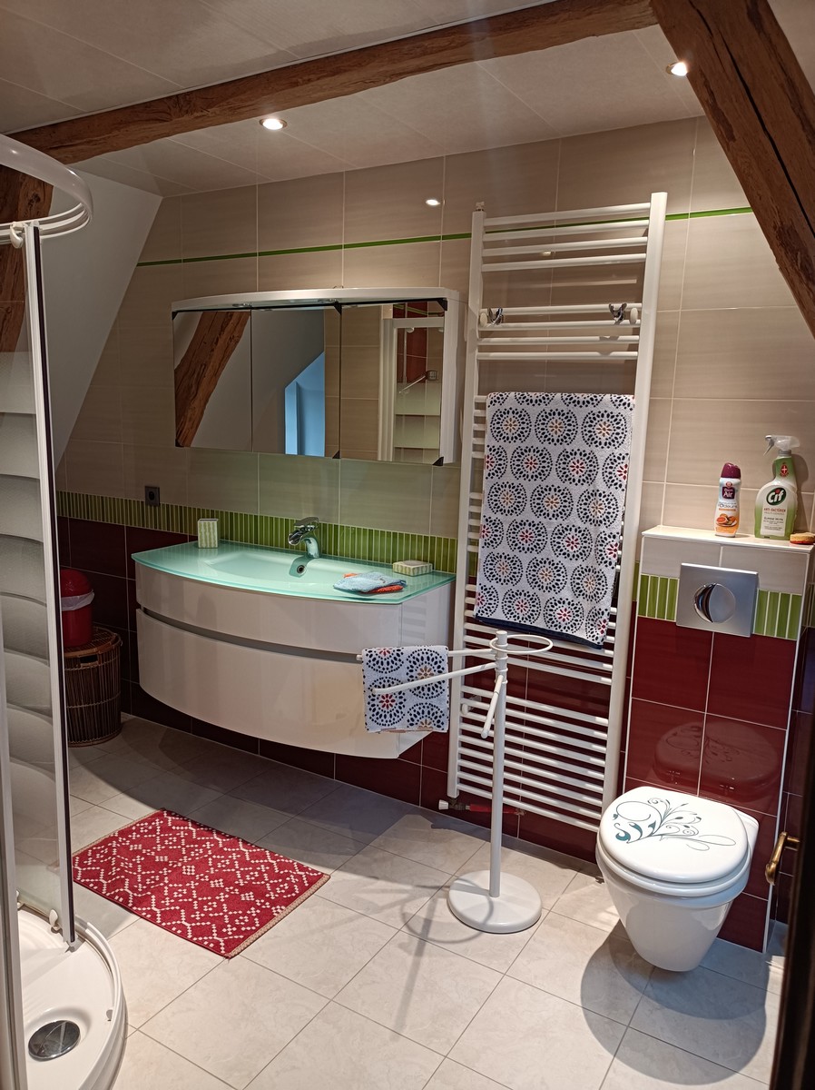 A l étage grande chambre avec poutres apparentes avec un lit double, et en face salle de douche avec WC.