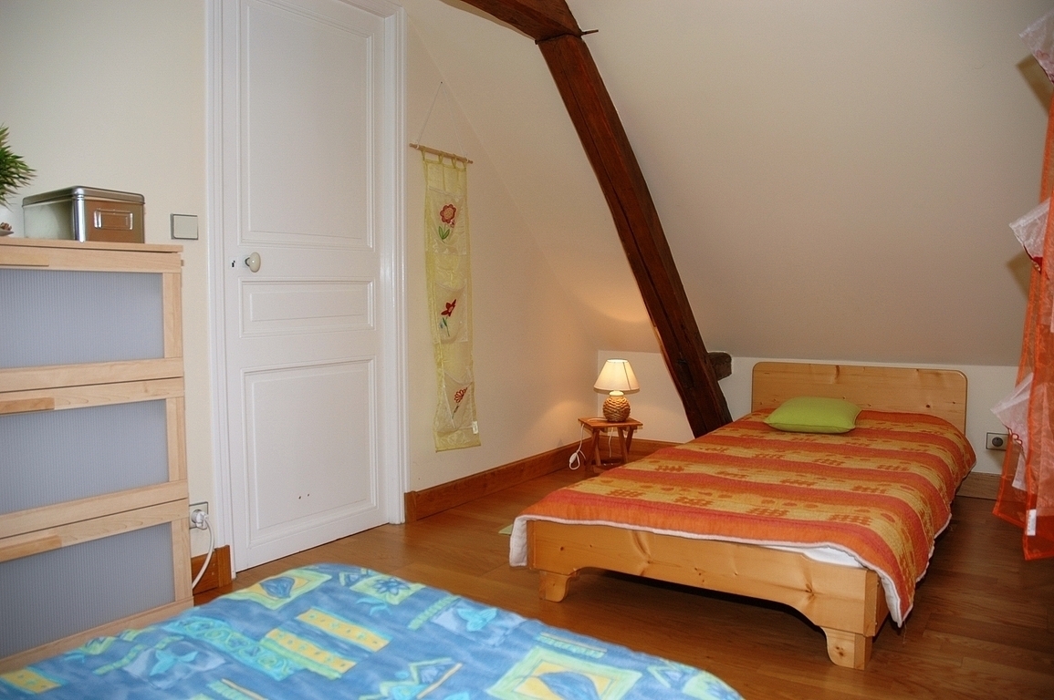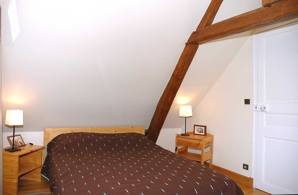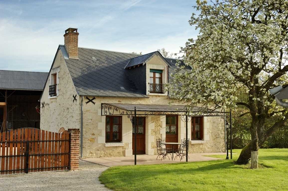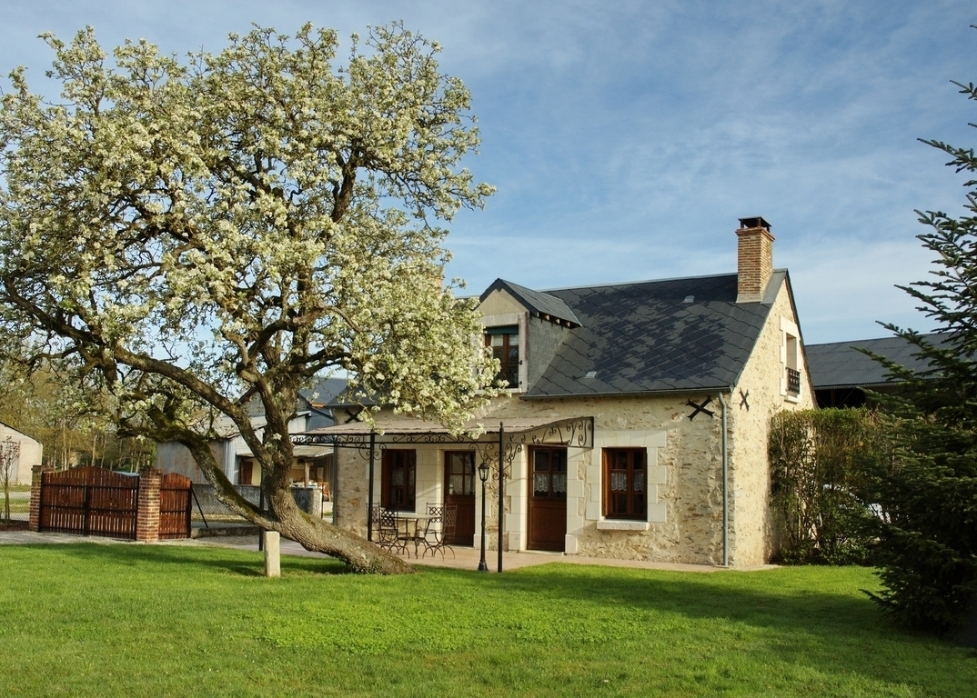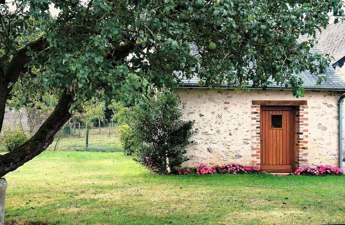 Gîte indépendant, ancienne maison de ferme XIXe, avec espace ombragé par un poirier centenaire.