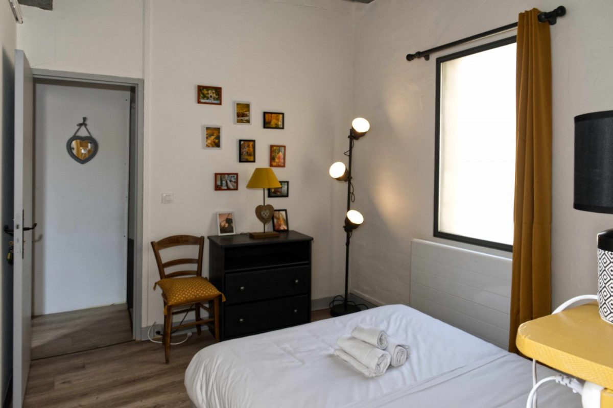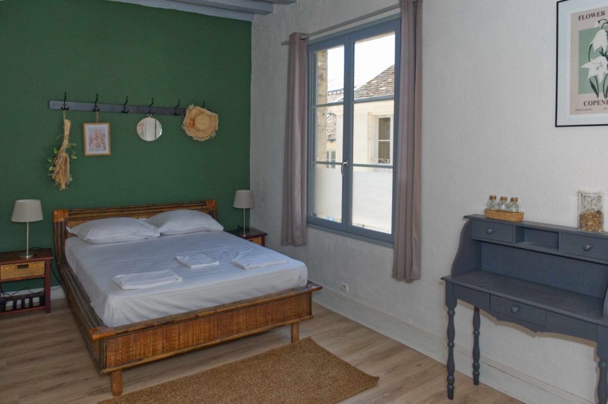Montez l'escalier en bois, une deuxiéme chambre ocre avec son lit de 140 et sa salle de bains et Wc privée et la troiséme suite parentale de 25m2 verte-olive avec sa salle de bains et Wc privée.