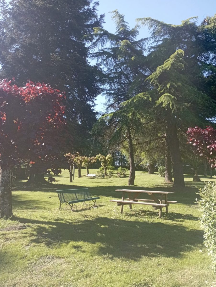 Au cœur d’un espace arboré mêlant feuillus et conifères, cette aire de pique-nique séduit par sa simplicité et son confort. La table et le banc en bois, posés sur une pelouse bien entretenue, offrent un lieu idéal pour se détendre, partager un repas ou simplement profiter du soleil filtré par les feuillages. Un petit coin de nature parfait pour une pause ressourçante en plein air.